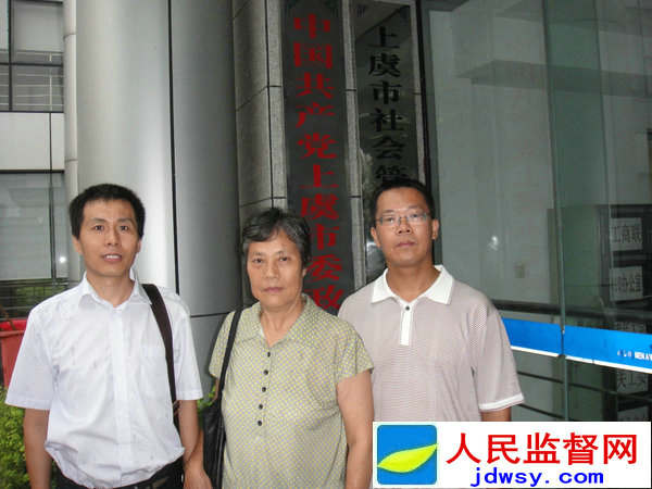 图:法学博士滕彪(右一)、访民王苗珍(中)、调查记者朱瑞峰(右三)在中共上虞市纪律检查委员会