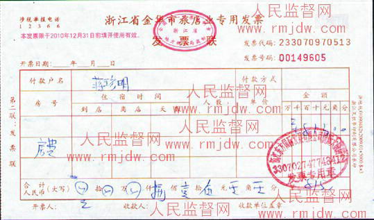 鉴于全国各大媒体及网民对瑞安市委书记蒋珍明“发票门”的热情和关注,人民监督网记者现推出瑞安市委书记蒋珍明先生,第四张手写无日期815元的浙江东方国际发展有限公司国际大酒店房费发票(见图片),敬请中共温州市委给公民纳税人予以解答。