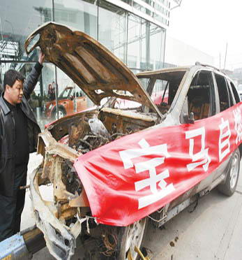 从昨天中午12时开始,很多大连市民都看见,一辆清障车拖着一辆被烧毁的宝马X5吉普车出现在大连市区主要交通干道上,在宝马车身上的条幅赫然出现“宝马自燃,公司不受理”的字样。