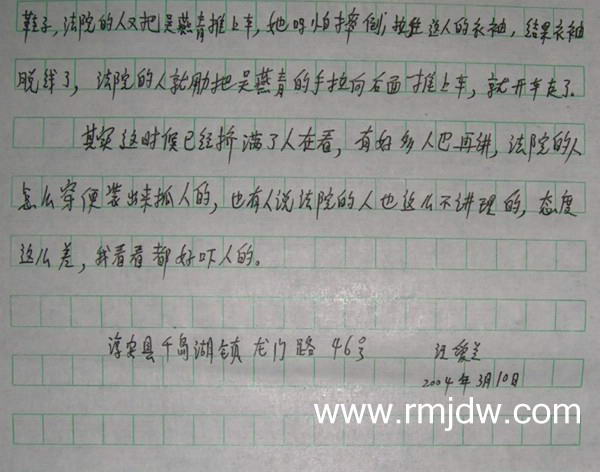 在看守所里,法院刑庭法官蒋烟民来提审我,他问我脸上的伤是怎么来的,他说,看我够不够得上15天的拘留,说他与执行庭不是一个庭的,叫我放心大胆地把事实讲出来,他们会主持公道的。他还说他把我妹妹的工作做通了,她回去已经喝水了。听他这么一说我很感动,头脑发热,一下子就放心地把过程实事求是地讲了一遍。但是讲了以后我又想他们都是法院的,我说我没有靠山,我是一个老百姓,而听说姚春妹是个局长,郑红进是科长,有谁能站出来为我说话呢,我又没有证人,他们会整死我的。我问蒋法官我该怎么办?我的话难住了蒋法官,他说叫我再考虑一下,他又说还是认为我要实事求是比较好。我想了想说,我还是要重写,前面的笔录不能要,坚持要他撕掉,他不肯撕,他说他还是在笔录后面加上一句“以上是我胡说的”比较好,我说那也好。后面我就不敢说是他们打的了。