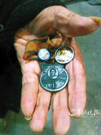 杨根奎曾经紧握钢枪的手展示着珍藏多年的证章。