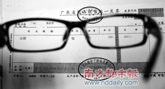 这是中石化广东石油分公司知情人向记者提供的一张“广东省商品销售统一发票”复印件。复印件上显示,2010年10月,“中石化广东广州石油分公司”将60瓶“白酒”以“单价”1661元卖给了广州一家酒类专营商行。新华社图