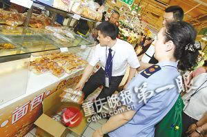 下午2点,工作人员与重庆晚报记者来到杨家坪家乐福,在销售蛋糕的柜台上,杨家坪工商所副所长余江仔细看了由康舒食品厂的芝麻糖后,眉头皱了起来,“这些芝麻糖肯定有问题。”