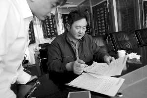 昨日中午,江苏男子徐庭荣(右)在北京才良律师事务所签署法律文件。本报记者 吴江 摄