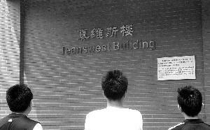 学生们正在观看清华“真维斯楼”的牌匾。金闻 摄