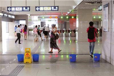 本报讯 (记者安颖)前日一场大雨,地铁13号线西二旗站的乘车大厅,再次摆放起水桶,用于接屋顶滴漏下的水滴,至昨晚滴漏情况仍未停止。