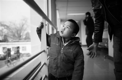 2010年11月,益益在京治疗。因为双目接近失明,益益抓到任何东西,都喜欢用嘴去咬,感觉这个东西。资料图片 韩萌 摄