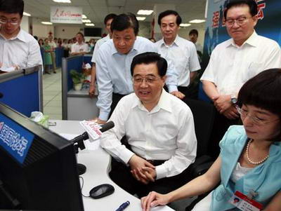 6月20日上午,中共中央总书记胡锦涛来到人民日报社考察工作,并通过人民网强国论坛与广大网民在线交流。