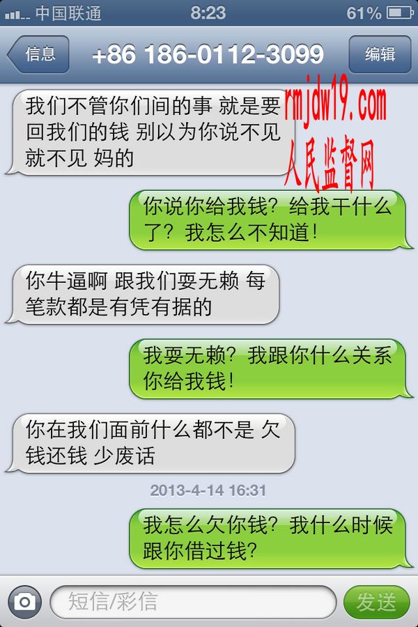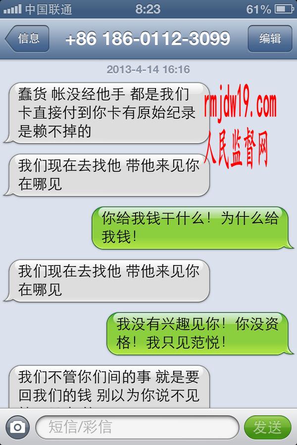 图:中南海高官范悦、浙商金忠等人向纪英男讨债的短信截图