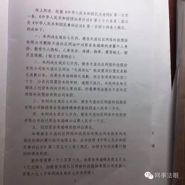朱瑞峰表示:感谢北京市西城人民法院合议庭为我朱瑞峰主持公道!并贴了判决书的照片,有图有真相!两张图片是被告汪海洋的败诉判决书,另外三张是被告天涯社区已经生效的败诉判决书和生效证明。