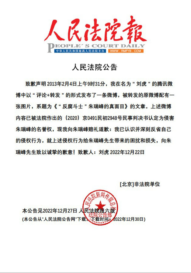 自媒体人刘虎在道歉声明中称:“我已认识并深刻反省自己的侵权行为,就上述侵权行为给朱瑞峰先生带来的困扰和损失,向朱瑞峰先生致以诚挚的歉意!”(详见人民法院公告网:https://rmfygg.court.gov.cn/web/rmfyportal/noticeinfo?content=%E6%9C%B1%E7%91%9E%E5%B3%B0 )