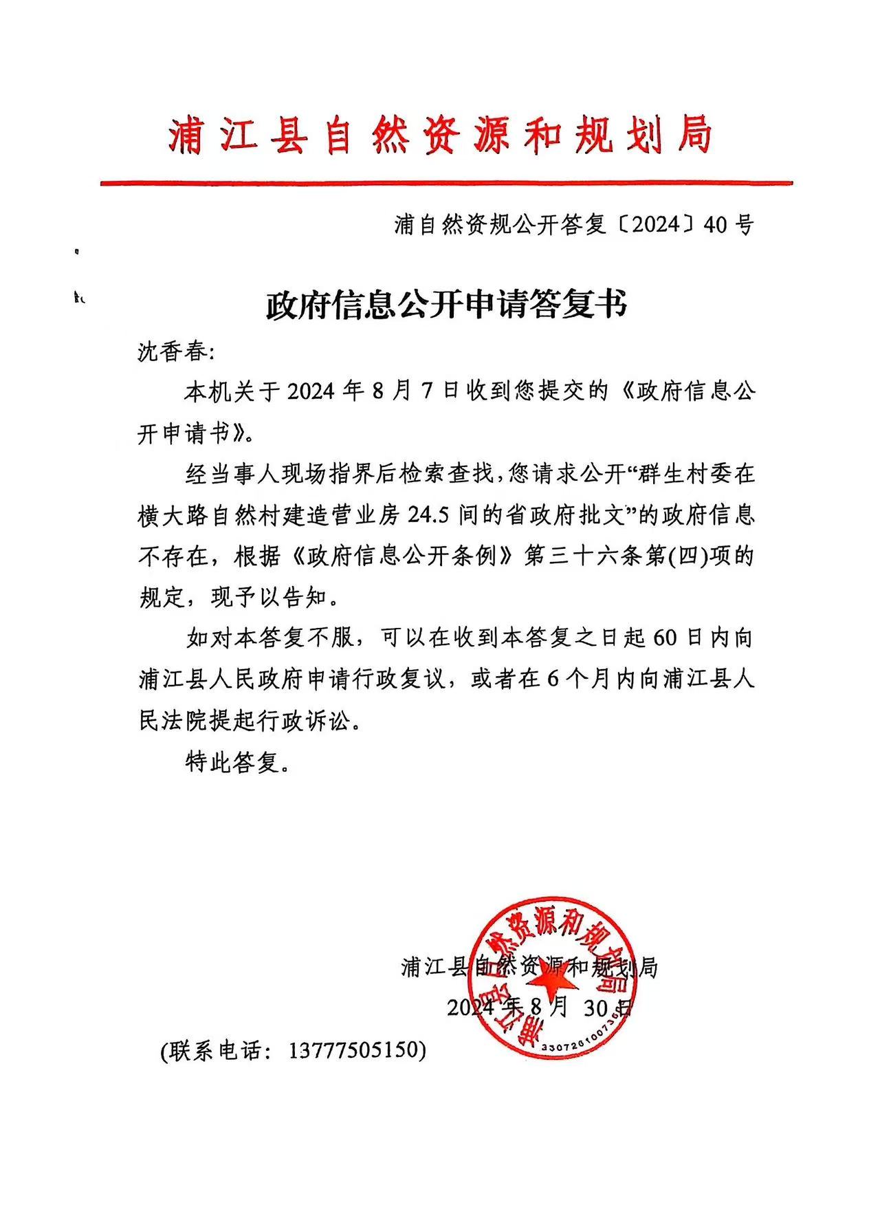 附:浦江县自然资源和规划局、浦阳街道办事处政府信息公开答复书两份