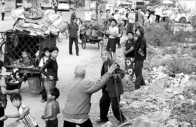 木先生(持棍者)和孩子有些冲动,一名年长者进行劝阻。本报记者蒲东峰摄 前天下午,在丰台区右安路出现蹬着人力三轮车一家8口,两个较小的孩子与狗同住车上的铁笼。当晚,一