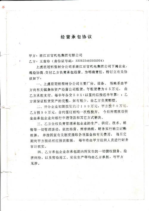1996年浙江省上虞市东关镇一家倒闭多年的中外合资企业公开对外承包。王苗珍经过熟人郭美澄的介绍前去承包。由于该合资企业尚欠中国银行上虞支行贷款,时任中国银行上虞支行的金一中行长为了能回收“死帐”,同意贷给承包人王苗珍100万元作为该企业的启动资金。银行贷款的条件是王苗珍必须找一乡镇企业挂靠,王挂靠了百官镇下属的浙江百官机电集团有限公司。同年8月28日,百官机电集团对外租赁承包,王苗珍以个人名义进行了风险承包,承包期暂定为三年,双方签订了协议,承包费为65万元。至此,确定了王苗珍个人承包破产企业的事实。