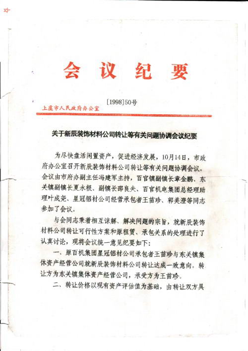 在王苗珍的强烈抗议下,1998年10月14日,上虞市政府组织镇政府、群众代表、百机集团承包人等召开了协调会议,确认王苗珍与百机集团原协议解除,将企业以300万元转资给王苗珍经营,同年签订了资产转让意向书。