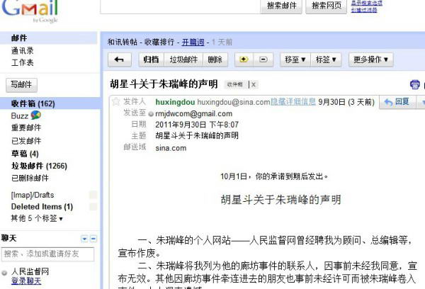 一、2011971109分,胡星斗教授发来手机短信:看到了,你多加注意,你有足够智慧对付他们,万一有事,我会过问。
