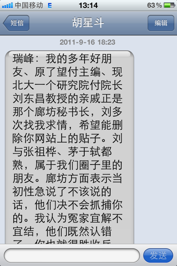 三、20119161823分,胡星斗教授发来手机短信:瑞峰:我的多年好友、原《瞭望》副主编、现北大一个研究院副院长刘东昌教授的亲戚正是那个廊坊秘书长,刘多次找我求情,希望能删除你网站上的帖子。刘与张祖桦、茅于轼都熟,属于我们圈子里的朋友。廊坊方面表示当初性急说了不该说的话,他们绝不会抓捕你的。我认为冤家宜解不宜结,他们既然认错了,你也就得胜收兵吧。也是给我一个面子,我好向朋友交代了。你悄悄撤掉帖子吧,不要声张,给对方一点面子,以上内容都不要上网。下次我们与刘教授见一面,他在北外也兼职带硕士研究生,他跟圈内的民主朋友都很熟。谢谢你,胡