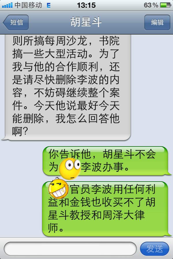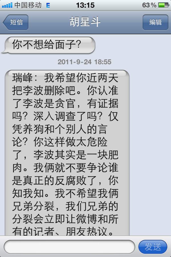 七、20119241855分,胡星斗教授发来手机短信:瑞峰:我希望你近两天把李波删除吧。你认准了李波是贪官,有证据吗?深入调查了吗?仅凭养狗和个别人的言论?你这样做太危险了,李波其实是一块肥肉。我俩就不要争论谁是真正的反腐败了,你知我知。我不希望我俩兄弟分裂,我们兄弟的分裂会立即让微博和所有的记者、朋友热议。你前面答应我的,我相信你能做到。给我面子,你不会吃亏,反之大家都受害。我之所以这么认真不仅因为关系到我与朋友的事业合作,更是涉及对于一个人是贪官还是普通官员由谁来认定?是否可以不经调查而认定?也涉及对朋友的考验。这是我最后一次为这事给你短信,我希望以后我们还是师生俩、兄弟俩。