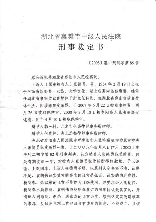 2008年4月8日,湖北省襄南监狱一级警督张德勇被枣阳市法院判决受贿罪成立,并判处有期徒刑一年。张德勇警官不服一审判决,当庭向襄樊市中级法院提起上诉.